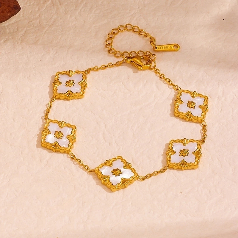 The Blossom Charm Bracelet features a series of delicately framed floral motifs crafted from white shell, each one adding a gentle touch of refinement to the wrist. The symmetrical arrangement creates a balanced, graceful look, while the polished golden details bring warmth and sophistication.