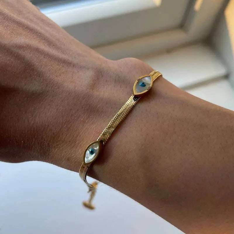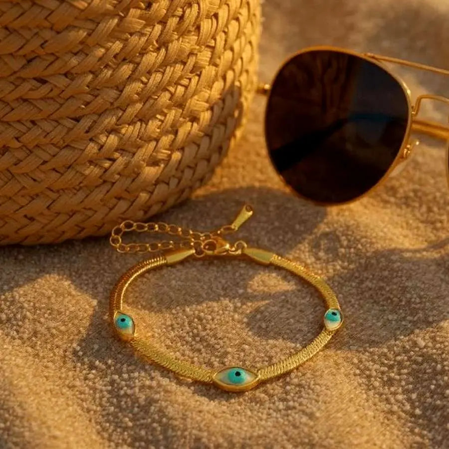 Design: Gold chain bracelet with blue evil eye motifs