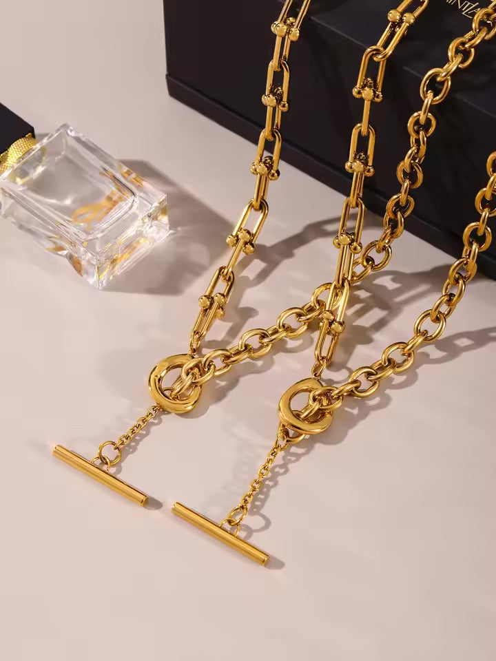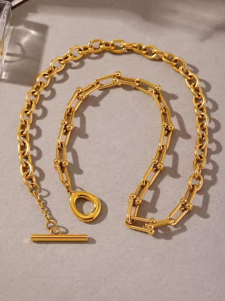 Striking, modern, and full of effortless confidence — the Boldly Yours Necklace is designed for those who love romance with a touch of strength. The chunky golden links create a beautiful rhythm around the neckline, while the elegant toggle clasp sits softly at the center like a statement of devotion.