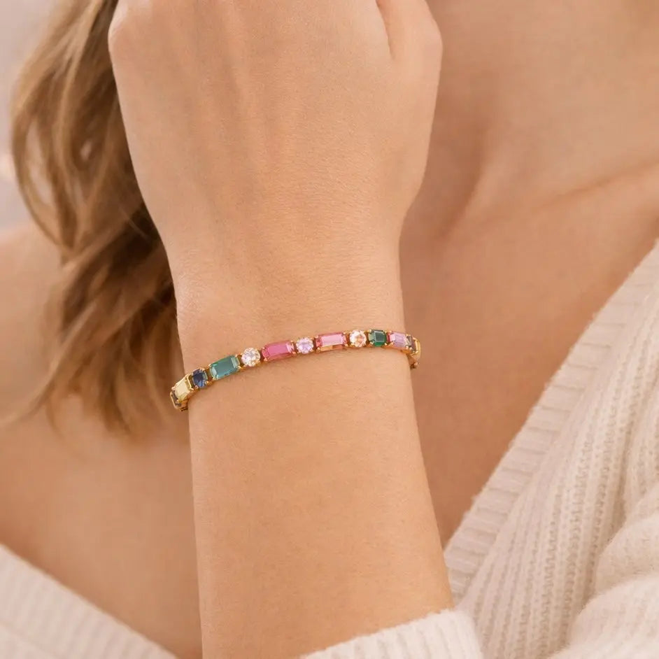 The Chromatic Luxe Bracelet showcases a striking arrangement of multicoloured zircon stones, each one precision-cut to create a seamless ribbon of light and colour. The vivid palette—ranging from soft pastels to rich jewel tones—adds a modern, artistic twist to the classic tennis bracelet silhouette.