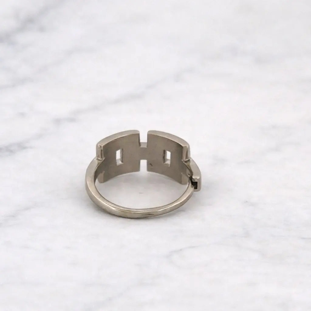 The Crystal Link Ring features a structured geometric design with interlocking segments, each accented with shimmering zircon stones. The clean lines and layered detailing create a bold yet refined look, blending modern edge with timeless elegance.