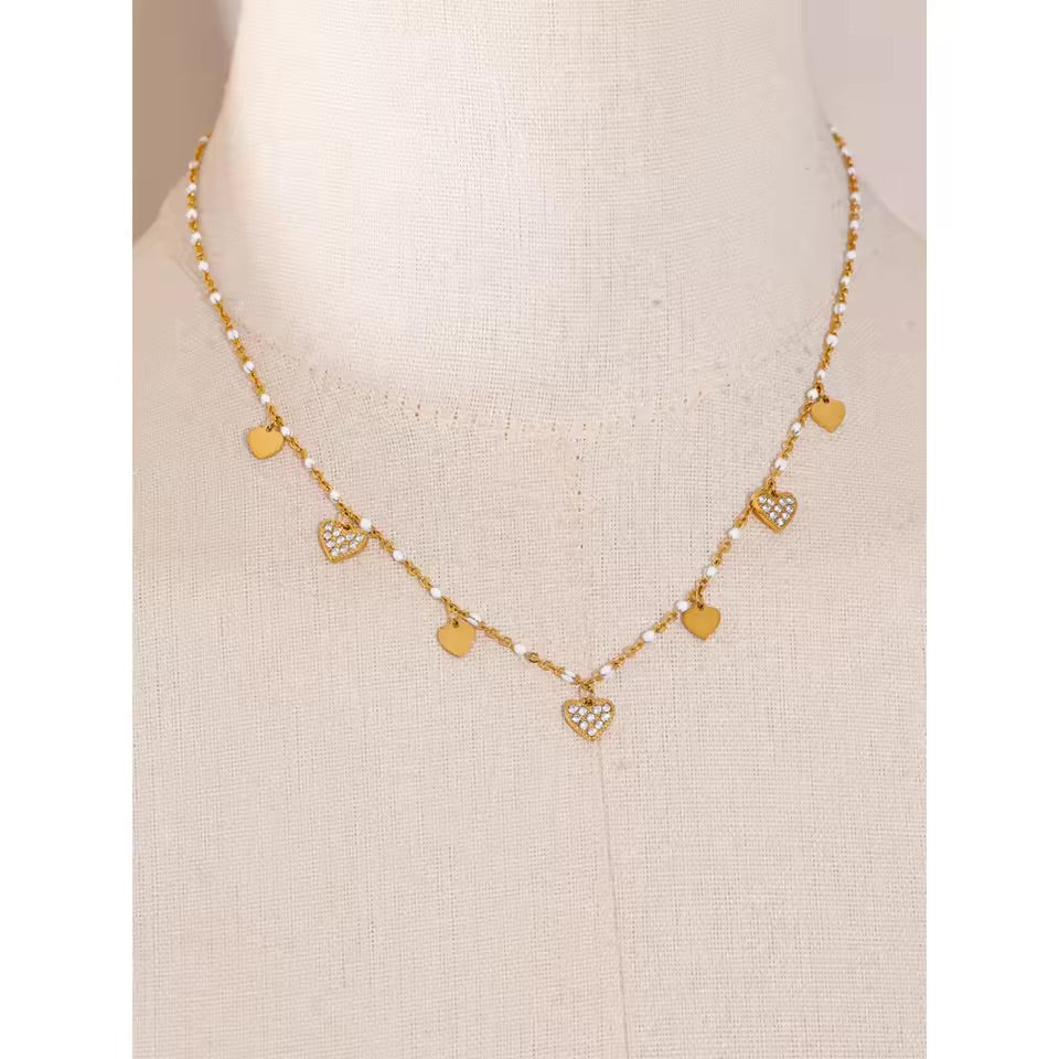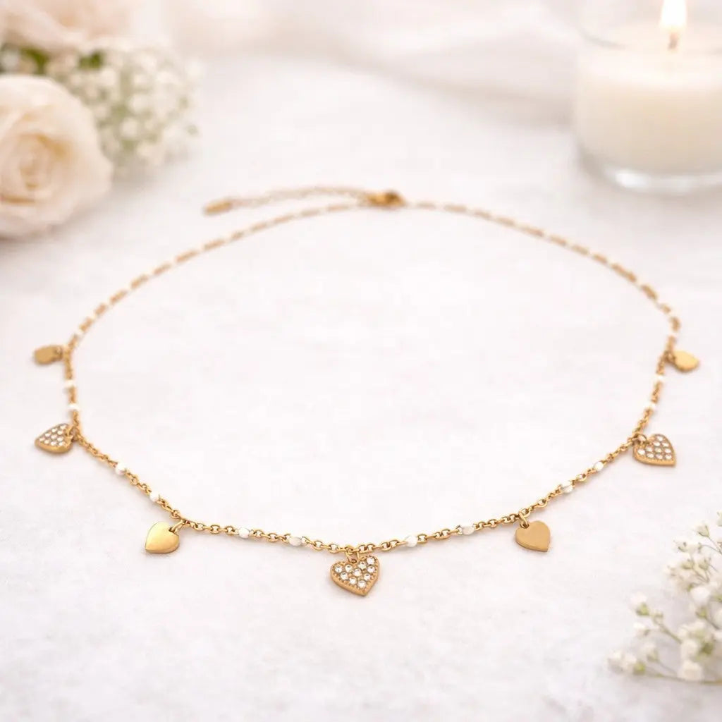 Soft, playful, and filled with tender charm — the Dancing Hearts Necklace brings a touch of joy to every moment. Tiny golden hearts shimmer gracefully along the chain, while sparkling zircon-studded hearts add a delicate glow with each movement. Their gentle rhythm creates a necklace that feels light, feminine, and beautifully expressive.