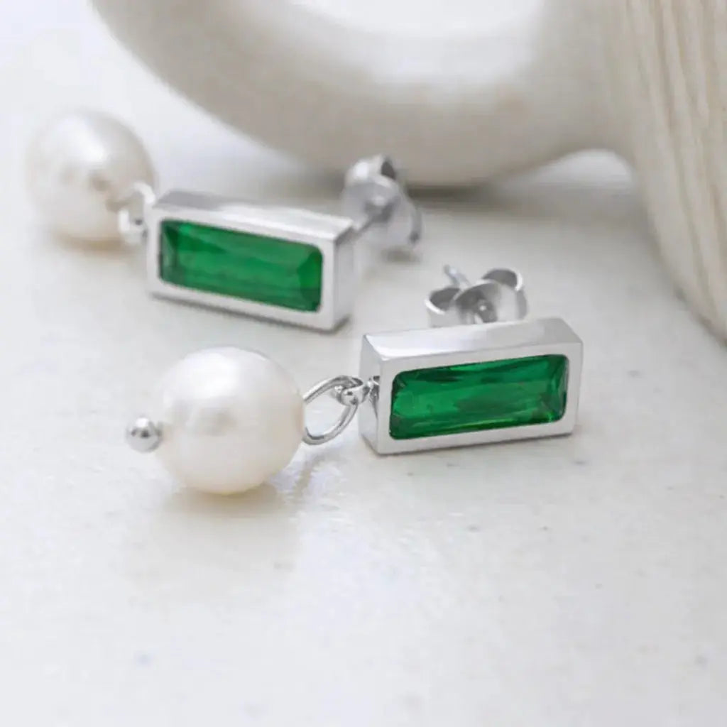 Elegant and captivating, the Emerald Moonfall Drops blend deep green brilliance with the soft glow of freshwater pearls. The rectangular zircon stone creates a striking vertical line that elongates the silhouette, while the luminous pearl below adds gentle movement and timeless charm.
