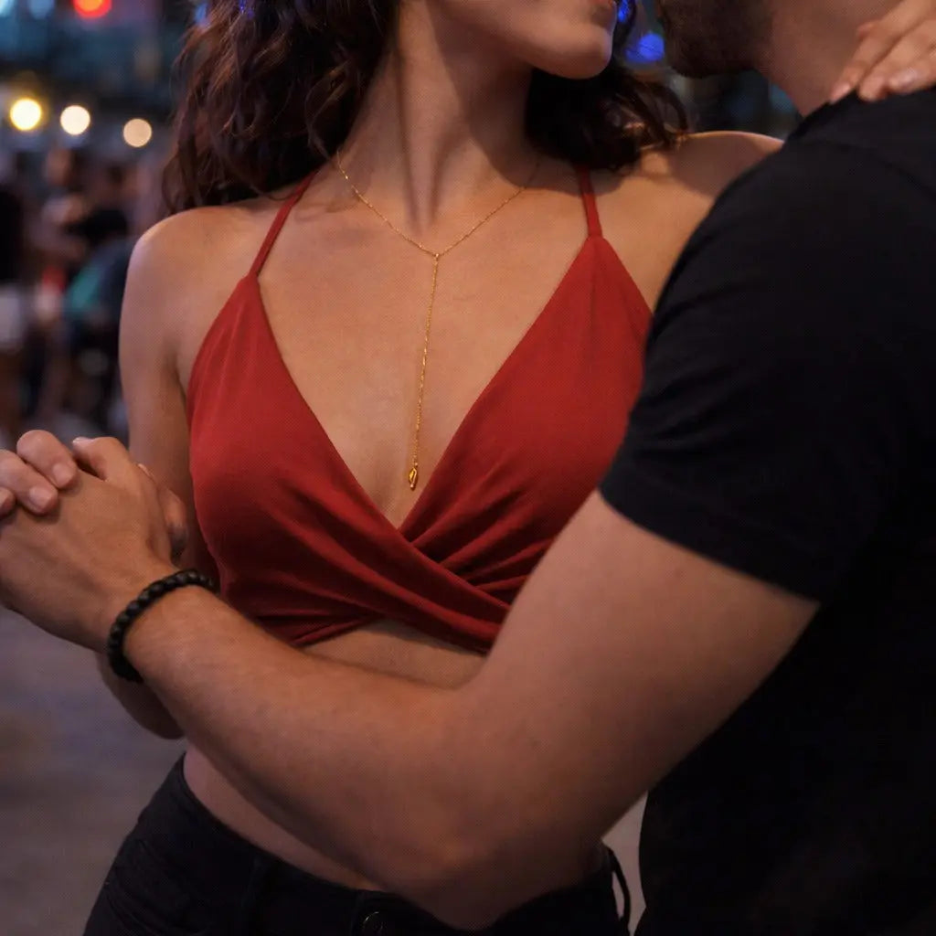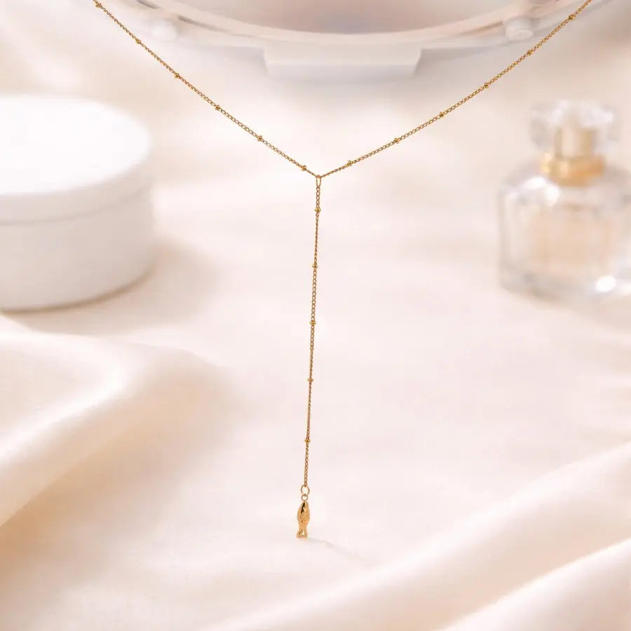 Long, delicate, and beautifully refined — the Falling Grace Necklace drapes down the neckline like a soft golden line of poetry. Its slender Y-shaped silhouette moves gently with the body, creating a look that is both elegant and irresistibly feminine.