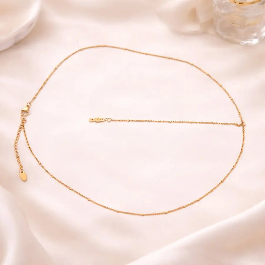 Tiny golden details shimmer along the chain, leading to a graceful drop that elongates the figure and adds a whisper of sophistication. Perfect for layering or wearing with open-neck outfits, Falling Grace is a piece that feels romantic, effortless, and endlessly flattering.