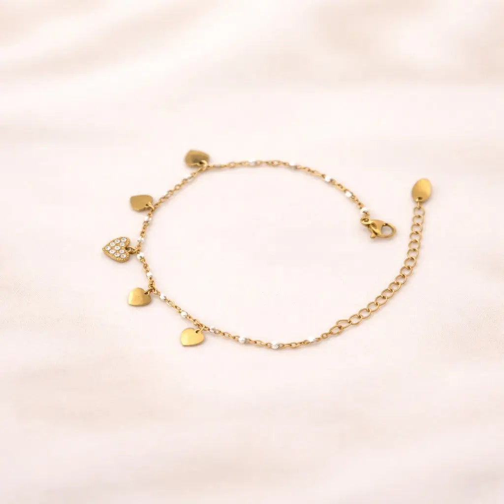 The Heartlit Charm Bracelet brings together delicate golden hearts and a shimmering zircon-studded centrepiece, creating a bracelet that feels light, graceful, and effortlessly feminine. Each charm moves gently along the chain, catching the light with a soft, romantic glow.