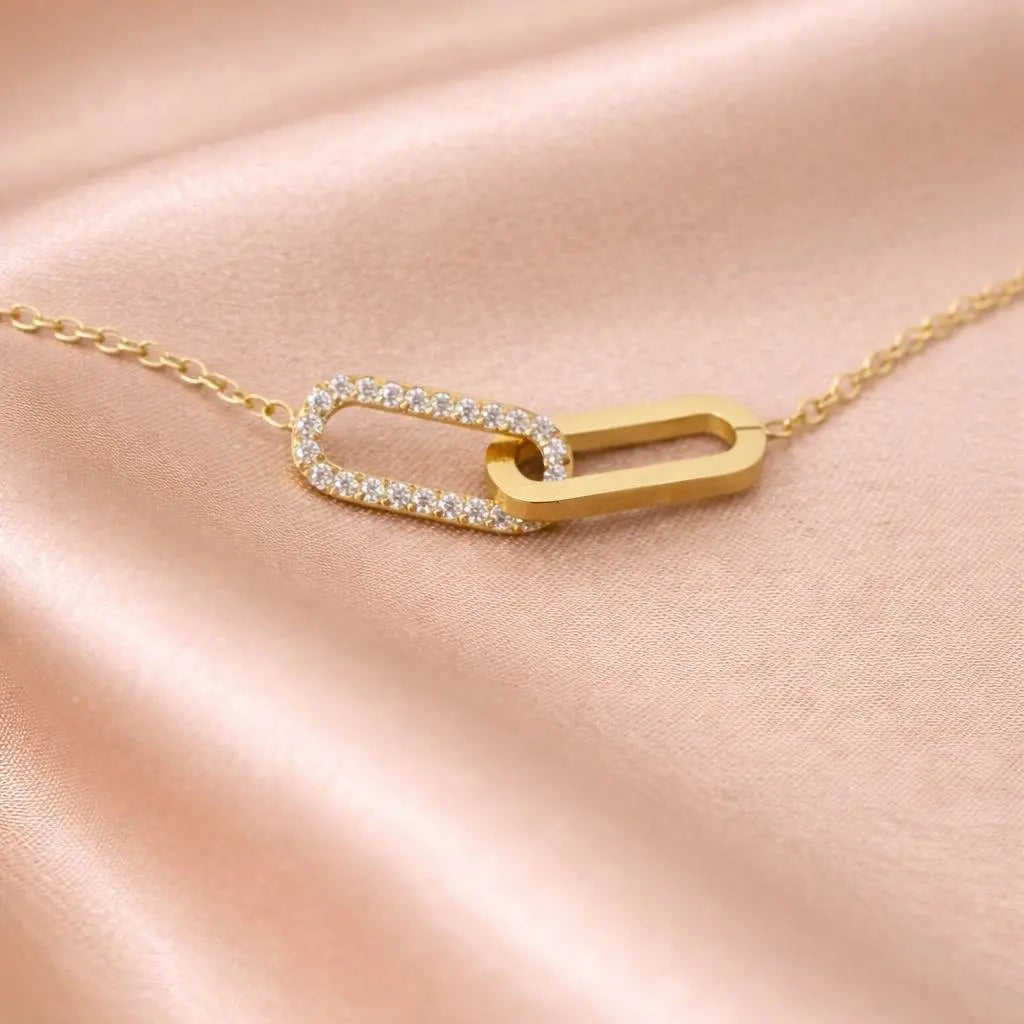 The Linked Grace Bracelet features two interlocking links—one polished gold, the other paved with sparkling zircon—creating a refined blend of modern simplicity and understated luxury. The delicate chain keeps the design light and minimal, allowing the centrepiece to stand out with quiet sophistication.