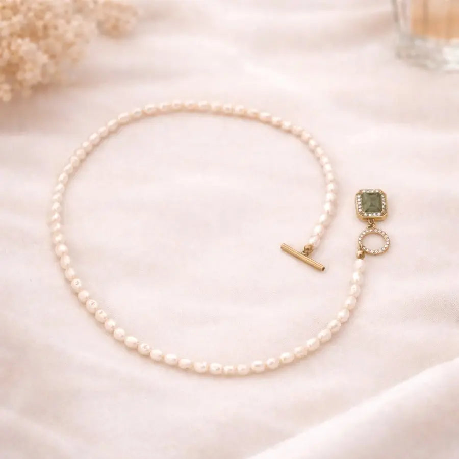 The Lovebound Pearl Necklace blends classic pearl elegance with a modern, structured finish. A strand of luminous freshwater pearls offers a soft, natural radiance, while the front toggle clasp introduces a contemporary detail that draws the eye. The central gemstone pendant, framed with delicate zircon accents, adds a refined touch of brilliance that enhances the necklace’s balanced, upscale look.