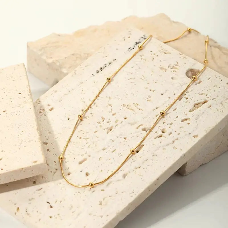 The Minimal Bead Necklace is designed with simplicity at its core, featuring a slender gold chain highlighted by subtle, polished bead accents. The gentle curve of the chain and precise bead placement create a soft, balanced look that feels refined without effort.