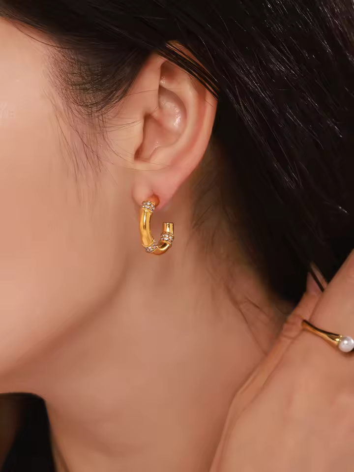 Bold yet refined, the Orbit Beam Hoops combine smooth golden curves with subtle crystal accents to create a design that feels modern, radiant, and effortlessly chic. The structured arc mimics the clean lines of celestial orbits, while the shimmering stones add a touch of stardust brilliance.