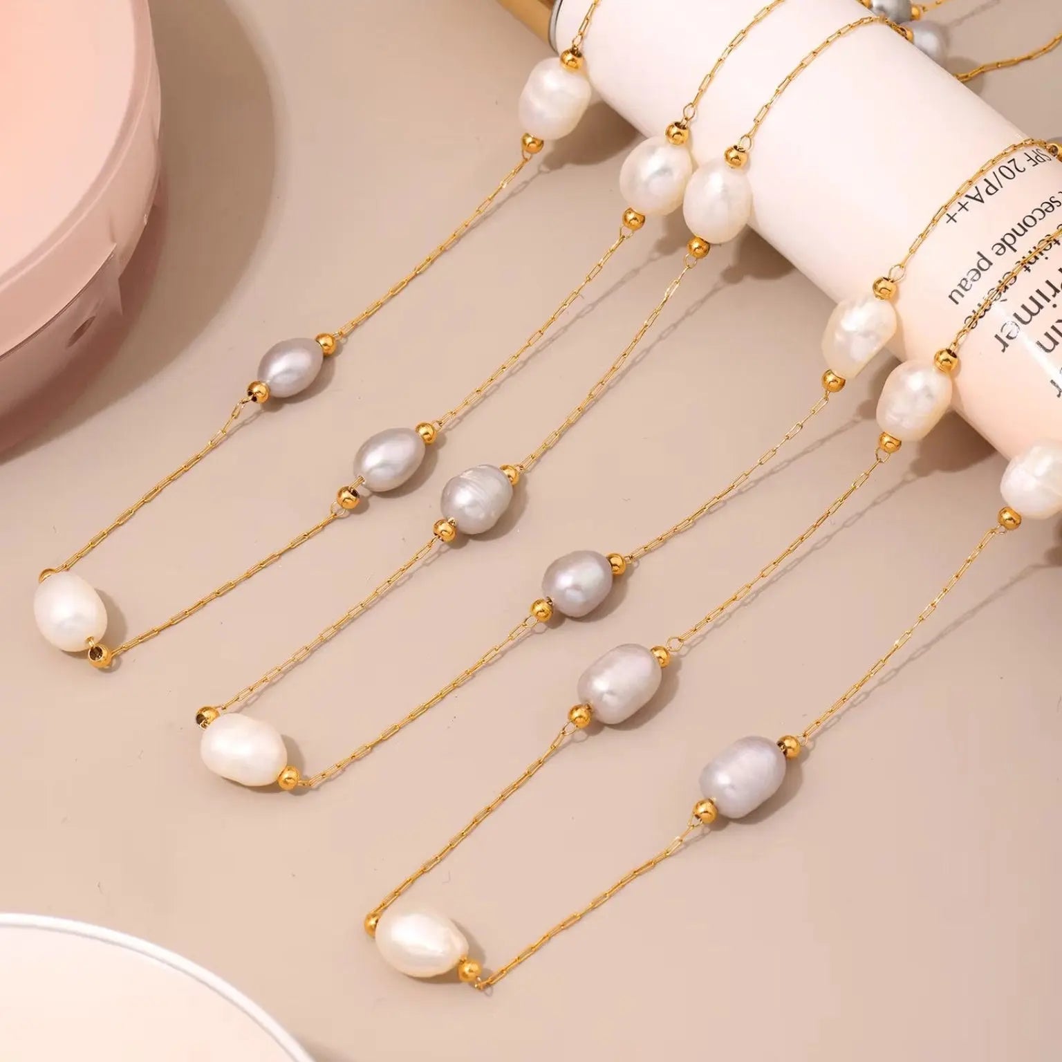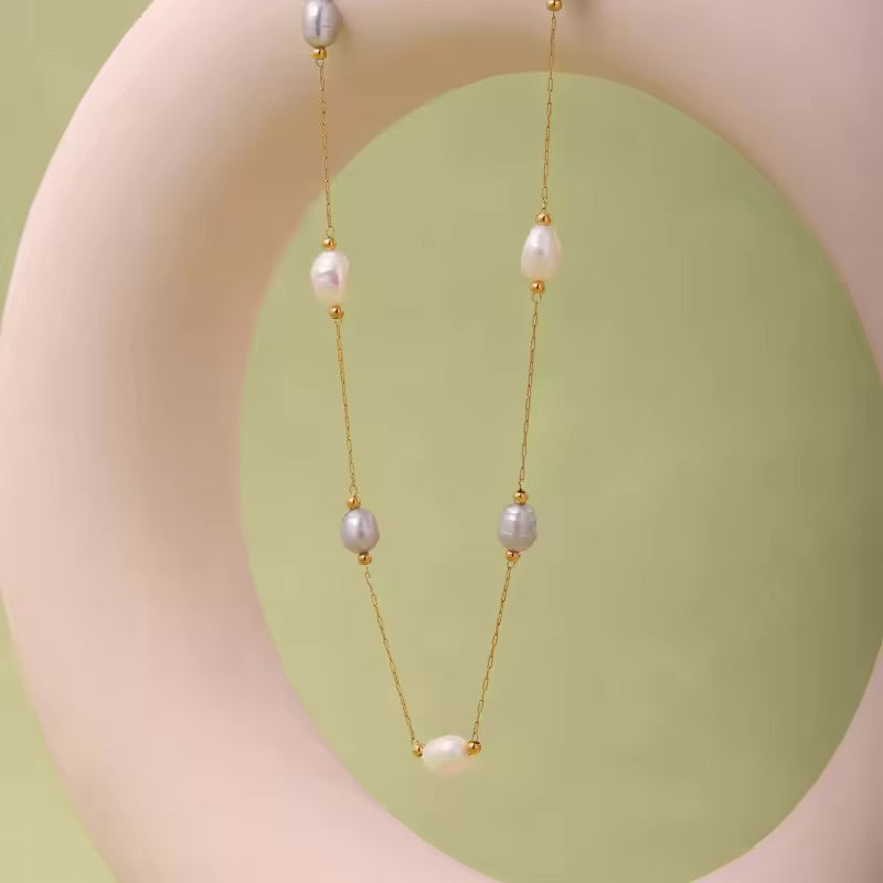 Soft, elegant, and beautifully melodic — the Pearl Serenade Necklace rests gently along the neckline with a sequence of natural freshwater pearls, each glowing with its own tender light. The mix of creamy and soft-grey pearls creates a dreamy rhythm, as if each one whispers a quiet verse of its own.