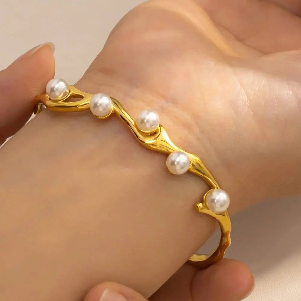 The Pearlwave Cuff blends fluid design with refined elegance. Its gently curved, wave-inspired silhouette wraps gracefully around the wrist, highlighted by softly glowing imitation pearls that bring a touch of luminance to the piece. The smooth golden finish adds structure and sophistication, creating a cuff that feels modern yet timeless.