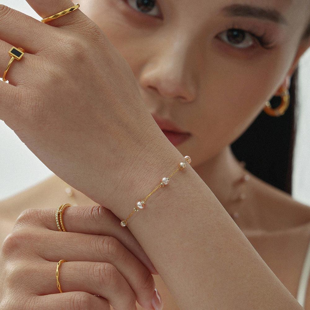The Rosewater Pearl Bracelet features a strand of dainty freshwater pearls in soft blush tones, spaced gently along a fine golden chain for an effortlessly refined look. Each pearl carries a subtle natural sheen, adding a delicate glow to the wrist with every movement.
