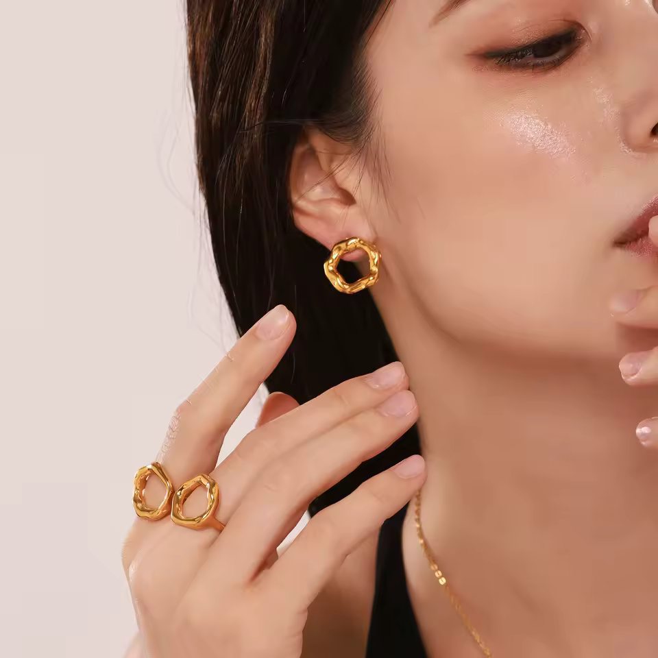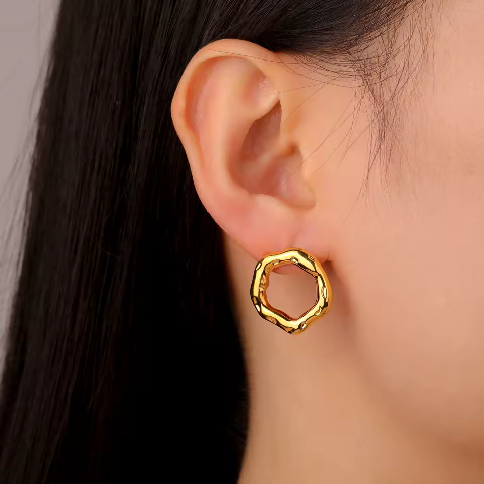 Bold, fluid, and quietly radiant — the Solar Drift Hoops capture the beauty of molten metal in motion. Their sculpted, irregular silhouette creates soft waves of light with every turn, giving the earrings an organic, handcrafted elegance that feels both artistic and effortlessly modern.