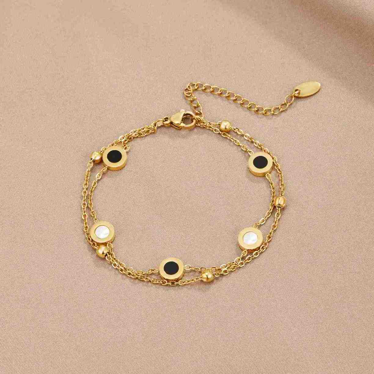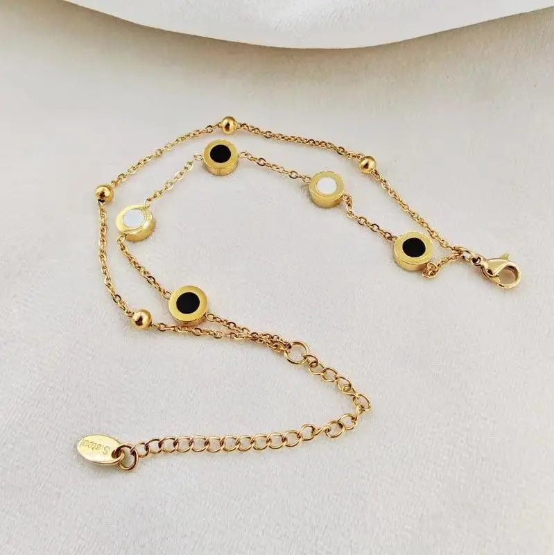 The Solar Orbit Disc Bracelet features a refined double-chain design accented with polished circular discs in contrasting black and white enamel. Inspired by orbital movement and balance, the evenly spaced elements create a rhythmic flow that feels both modern and timeless.