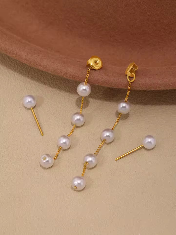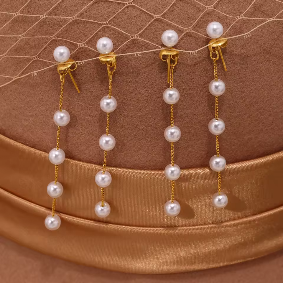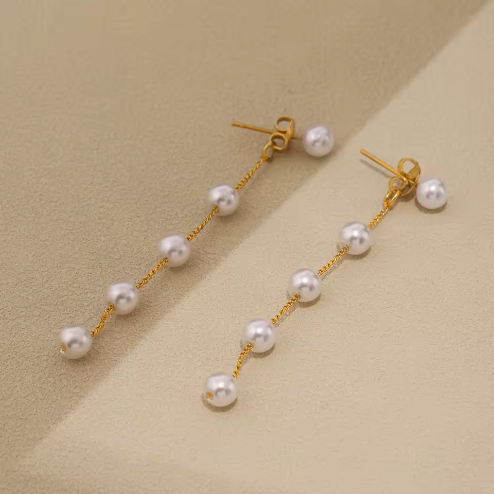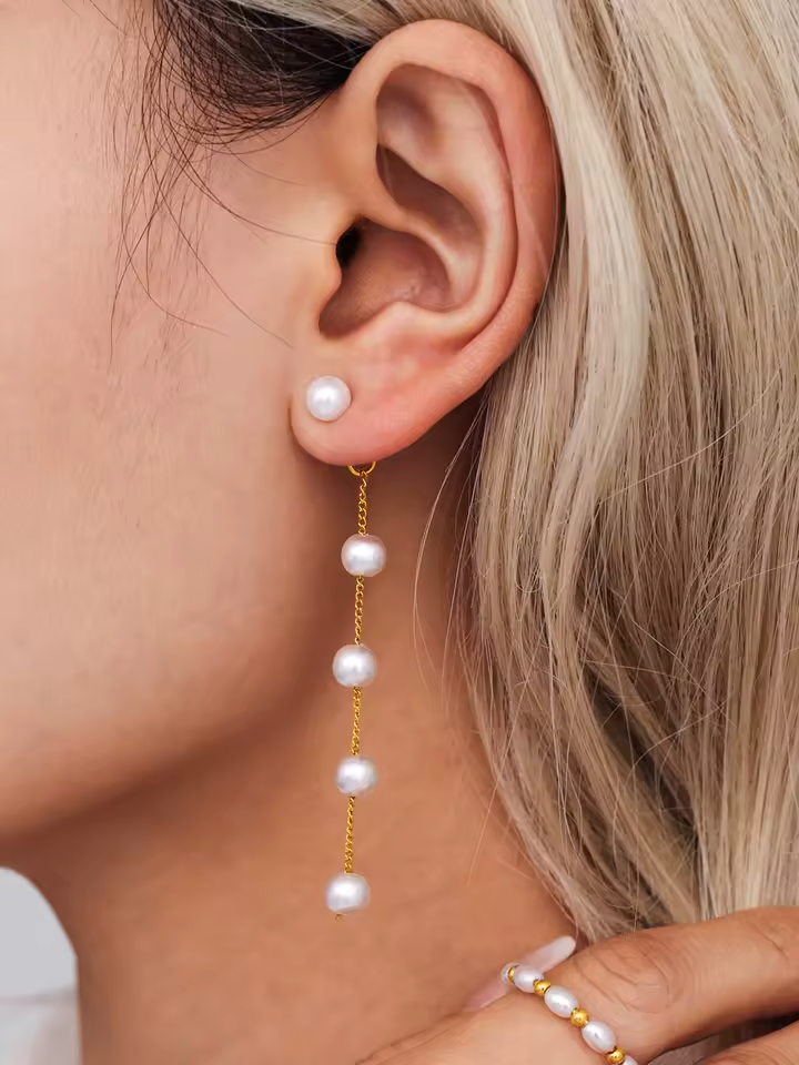 Light, graceful, and ethereal — the Starlight Cascade Drops shimmer with every subtle movement. A series of delicate pearls float along a fine golden chain, creating a gentle fall of luminous beads that resemble stars drifting across the night sky.