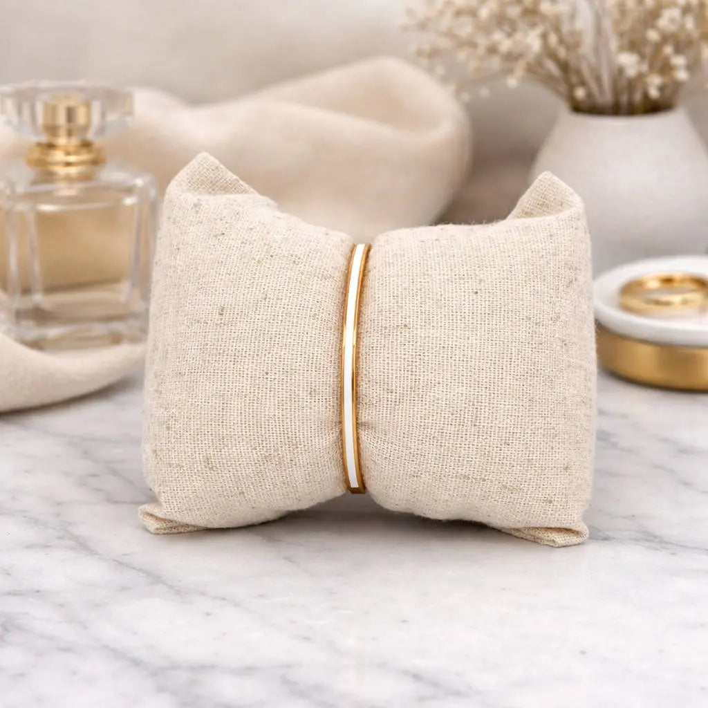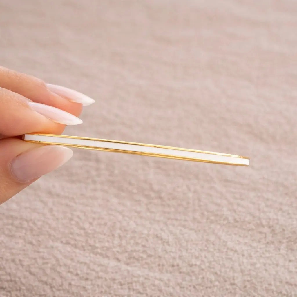 The Moonbeam Bracelet captures the quiet glow of moonlight with its slim gold silhouette and soft white inlay detail. Clean, minimal, and perfectly balanced, this piece is designed to feel light on the wrist while making a refined statement.